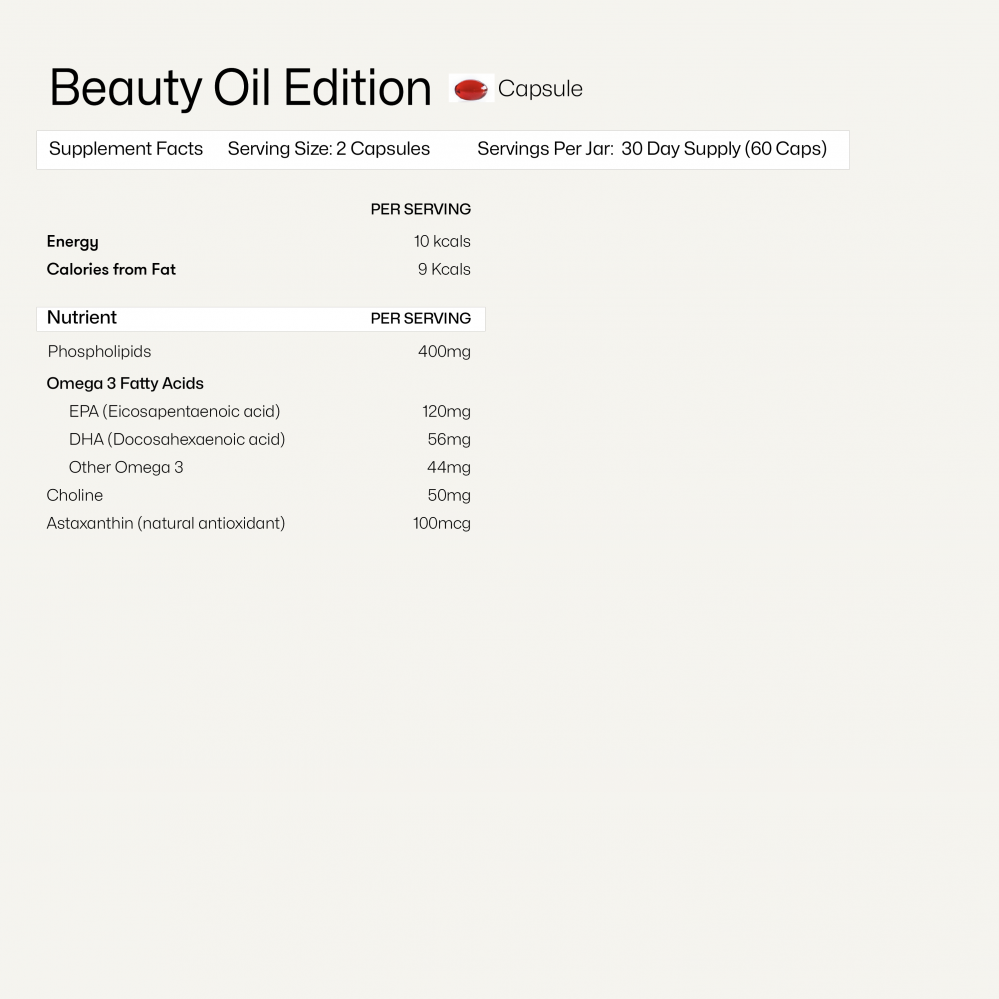 The first beauty-specific omega 3 krill oil supplement, BEAUTY OIL is nature’s ultimate superfood for skin. The natural glow-enhancing effect of pure krill oil, naturally rich in skin supporting nutrients astaxanthin and choline.