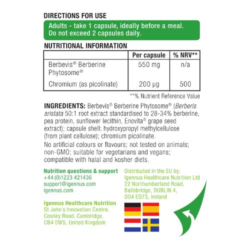 Berberine Phytosome & Chromium has been expertly formulated by Igennus nutrition scientists to provide dual action support and blood glucose management. This unique supplement is enriched with grape seed extract to ensure it is well tolerated by the stomach, minimising gut irritation.