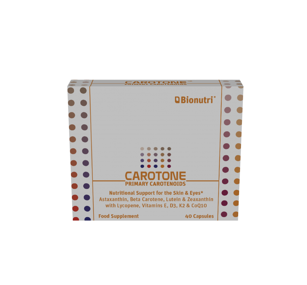 Nutritional support for the skin and eyes. Astaxanthin, beta carotene, lutein, zeaxanthin and lycopene with vitamins E, D3, K2 and CoQ10.