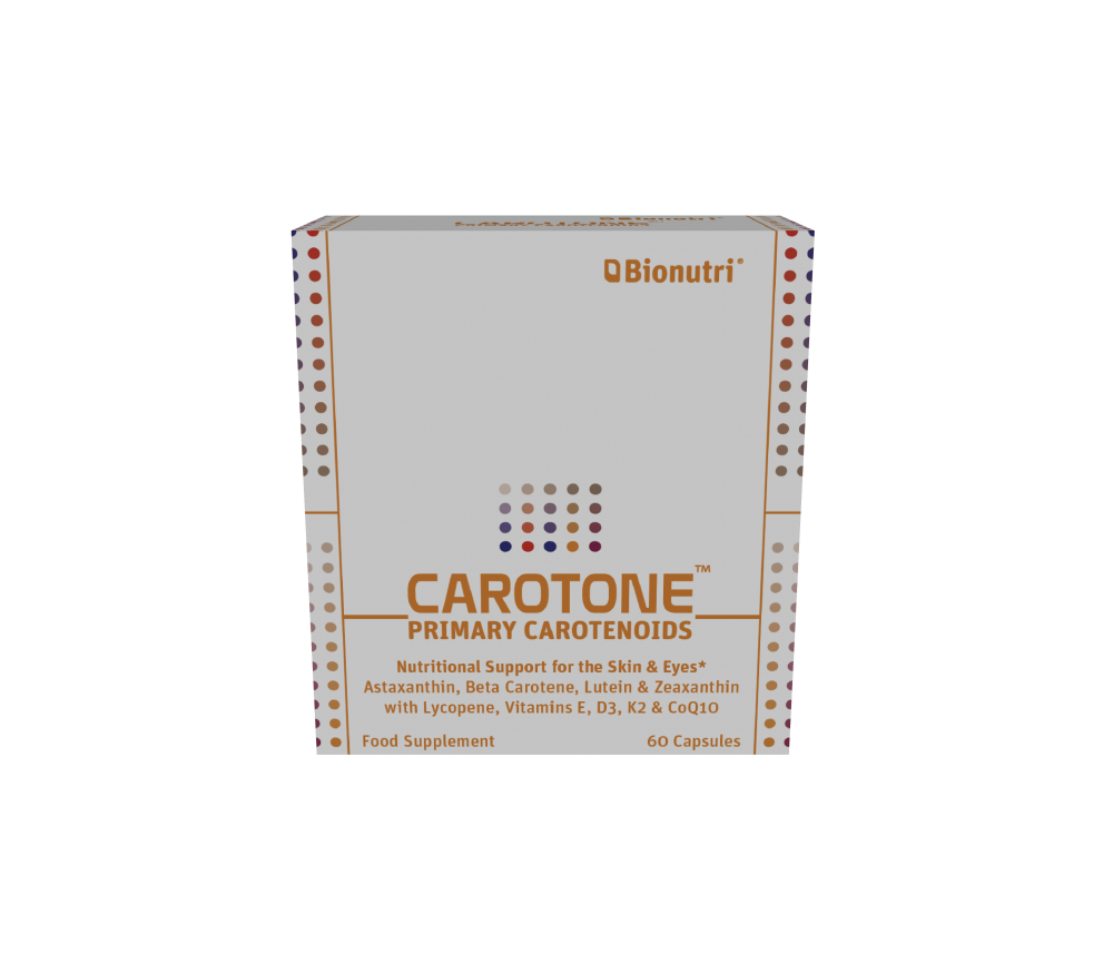 Nutritional support for the skin and eyes. Astaxanthin, beta carotene, lutein, zeaxanthin and lycopene with vitamins E, D3, K2 and CoQ10.