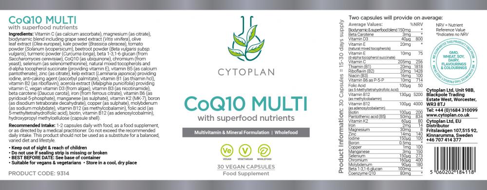CoQ10 Multi is Cytoplan's most comprehensive multivitamin and mineral supplement, now formulated with a UK first biodynamic and superfood fruit, vegetable and herb blend, which is especially rich in phytonutrients and active compounds.