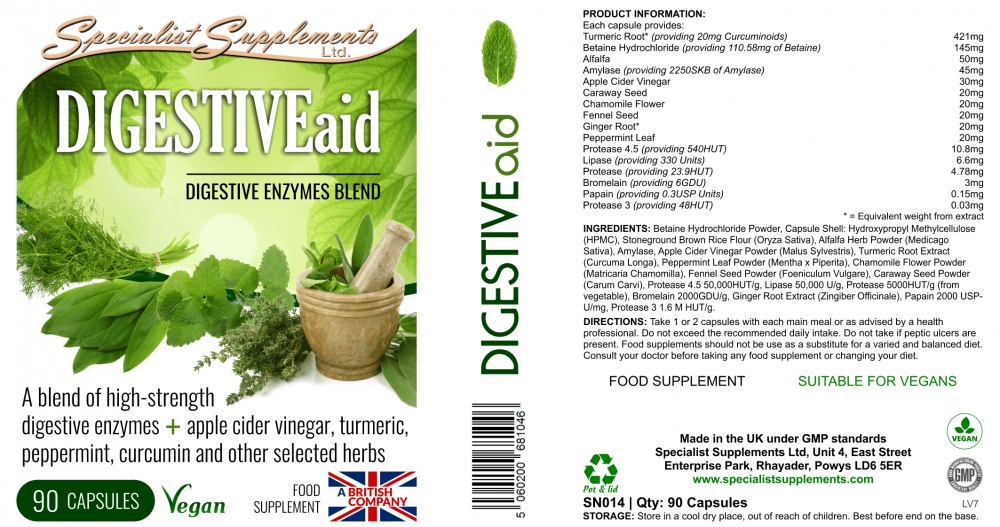 Plant-derived digestive enzymes (betaine hydrochloride, lipase, amylase, protease, bromelain and papain), combined with a range of herbs (alfalfa, apple cider vinegar powder, caraway seed, chamomile flower, fennel seed, ginger root, peppermint leaf and turmeric, with curcuminoids).