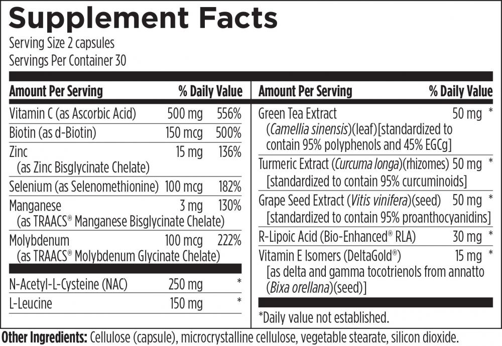 A synergistic formulation of multiple nutrients supporting glutathione production, healthy immune responses, antioxidant status, and phase II liver detoxification. Gluten free. Dairy free.