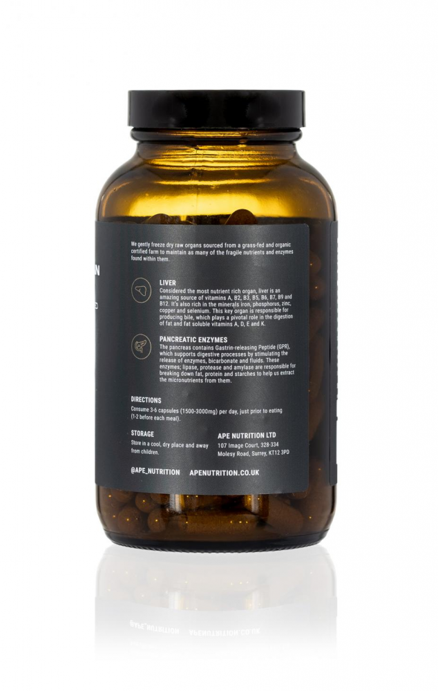 This complex is made up of two key digestive system organs; liver and pancreas. These contain vital vitamins, minerals, peptides and nutrients to support your digestion and nutrient absorption. APE created this digestive complex to support just this.