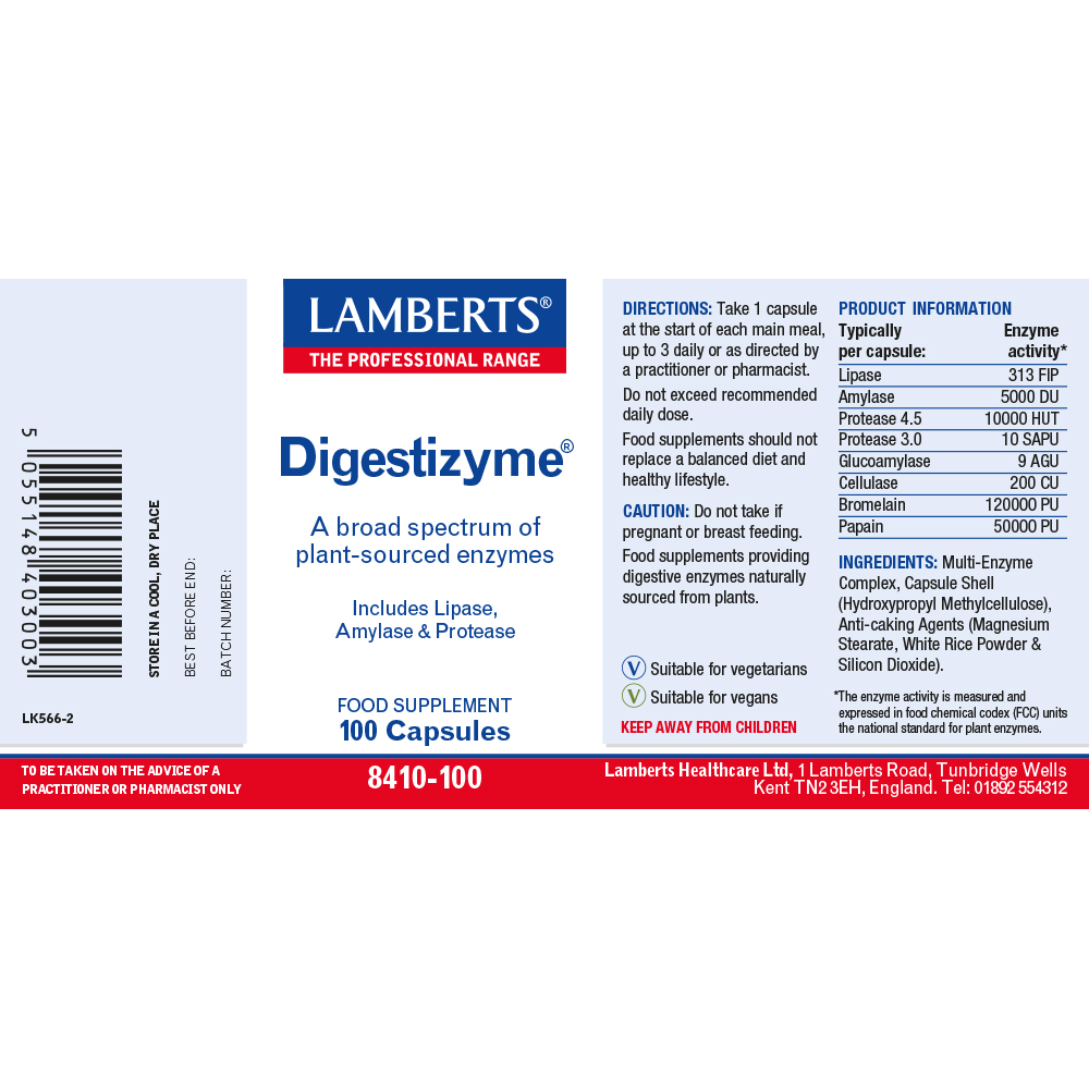 Provides a broad spectrum of plant-sourced enzymes, which digest protein, fat and carbohydrate. A supplement providing suitable digestive enzymes may make a useful contribution to the smooth working of the digestion process, particularly when the natural production of enzymes is reduced.