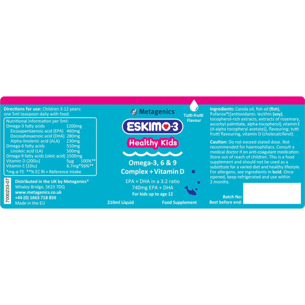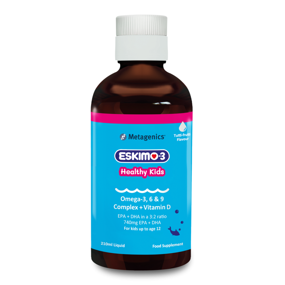 A pure, natural, essential fatty acid supplement formulated specifically to support optimal health in children aged 3 to 12. A child's brain and nervous system have different fatty acid requirements whilst growing, EskimoĀ®-3 Healthy Kids has been formulated to provide a balance of omega-3, 6 and 9.