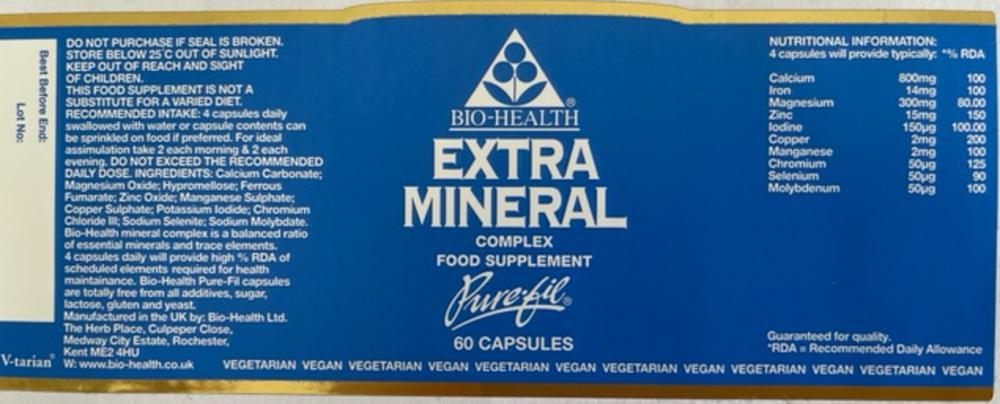 Bio-Health Extra Mineral Complex is a balanced ratio of essential minerals and trace elements. Four capsules daily will provide a high percentage RDA of scheduled elements required for health maintenance.