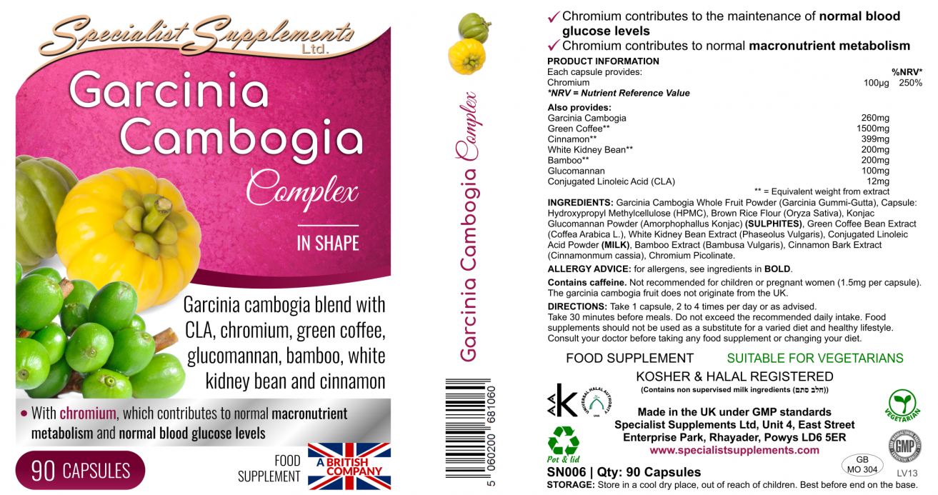 A herbal formula with garcinia cambogia, glucomannan, green coffee, white kidney bean, bamboo, conjugated linoleic acid (CLA), cinnamon and chromium picolinate - all in one easy-to-take capsule. Chromium contributes to the maintenance of normal macronutrient metabolism.