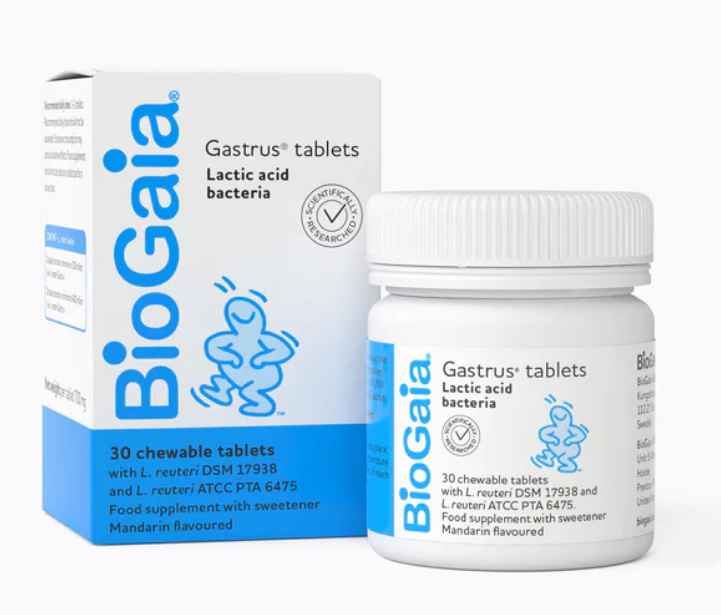 BioGaia Gastrus is a food supplement containing two patented lactic bacterium strains of L. reuteri, DSM17938 & ATCC PTA 6475, that help to balance the intestinal flora. Mandarin flavour chewable tablets. Safe for long-term daily use, from three years of age.