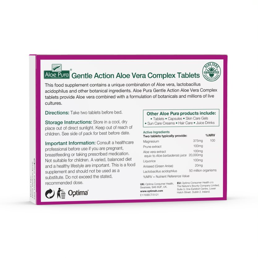 This food supplement contains a unique combination of aloe vera, lactobacillus acidophilus and other botanical ingredients. Aloe Pura Gentle Action Aloe Vera Complex tablets provide aloe vera combined with a formulation of botanicals and millions of live cultures.
