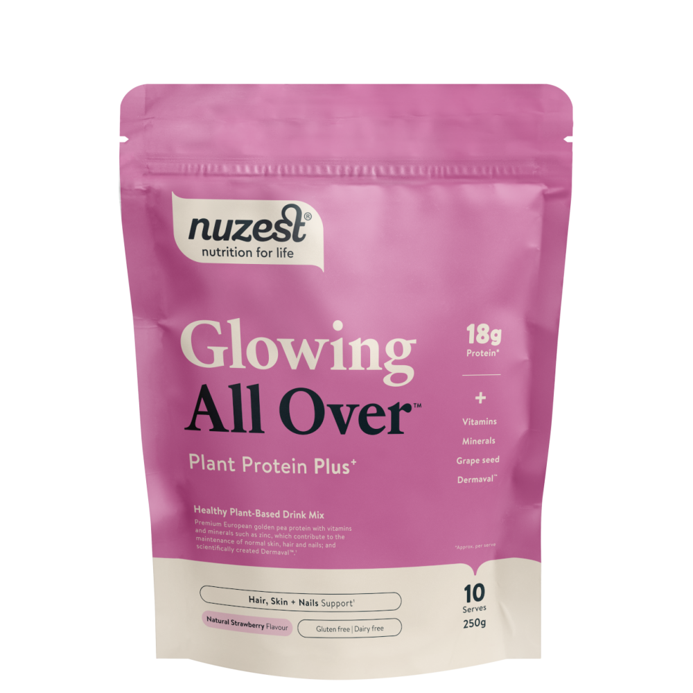 Strawberry flavour plant based drink mix for hair, skin, nails and collagen support. Glow up with Glowing All Over, carefully formulated to support healthy hair, skin and nails.