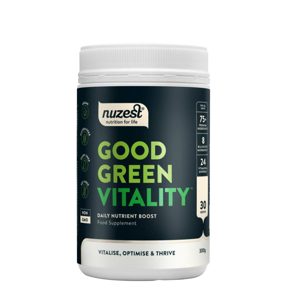 DAILY NUTRIENT BOOST - Food Supplement. Good Green Vitality is the ultimate nutrient boost to optimise your health - with vitamin C for healthy skin, 8B CFU microbiotics in every serve, vitamin D and zinc for normal immune function, and vitamins B6 and B12 to support normal energy release.