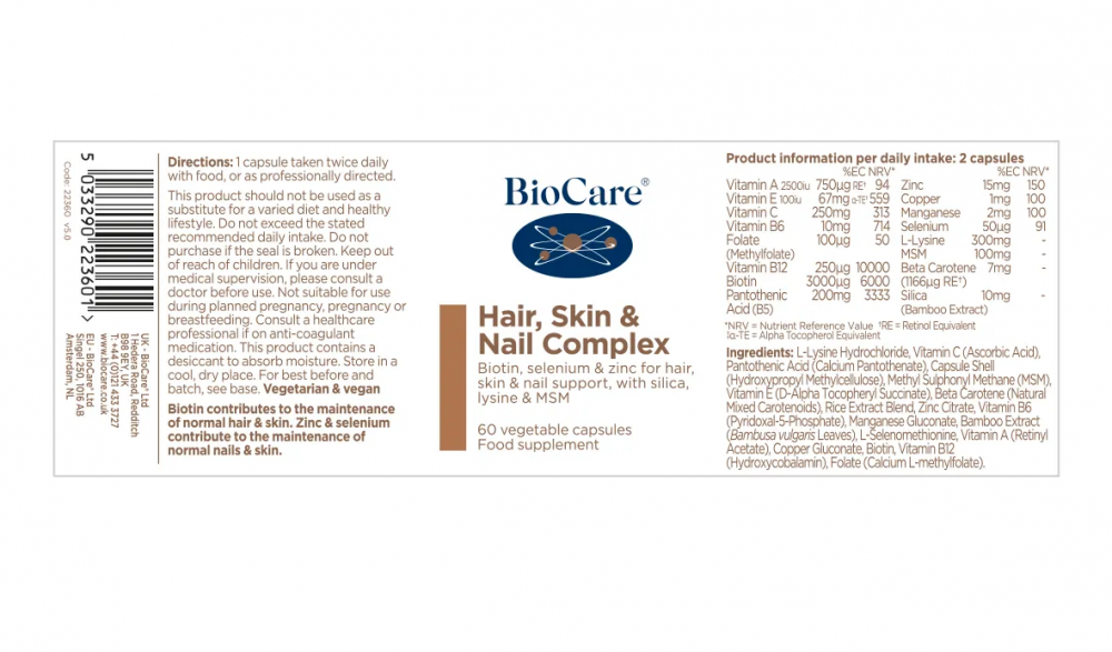 Hair, Skin & Nail Complex is a unique combination of nutrients including biotin, selenium, zinc, silica, lysine and MSM for hair, skin and nail support.