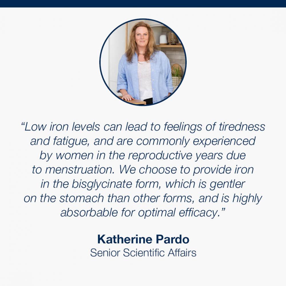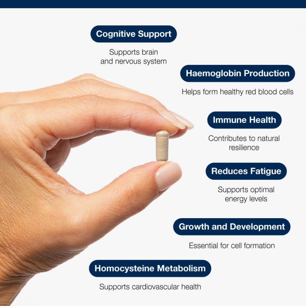 Provides iron as highly absorbable iron bisglycinate, well tolerated by sensitive digestion. Includes active folate (5-MTHF) and vitamin B6 (P-5-P) supporting red blood cell formation, normal energy, reduced fatigue, and homocysteine metabolism, aiding cardiovascular and cognitive health.