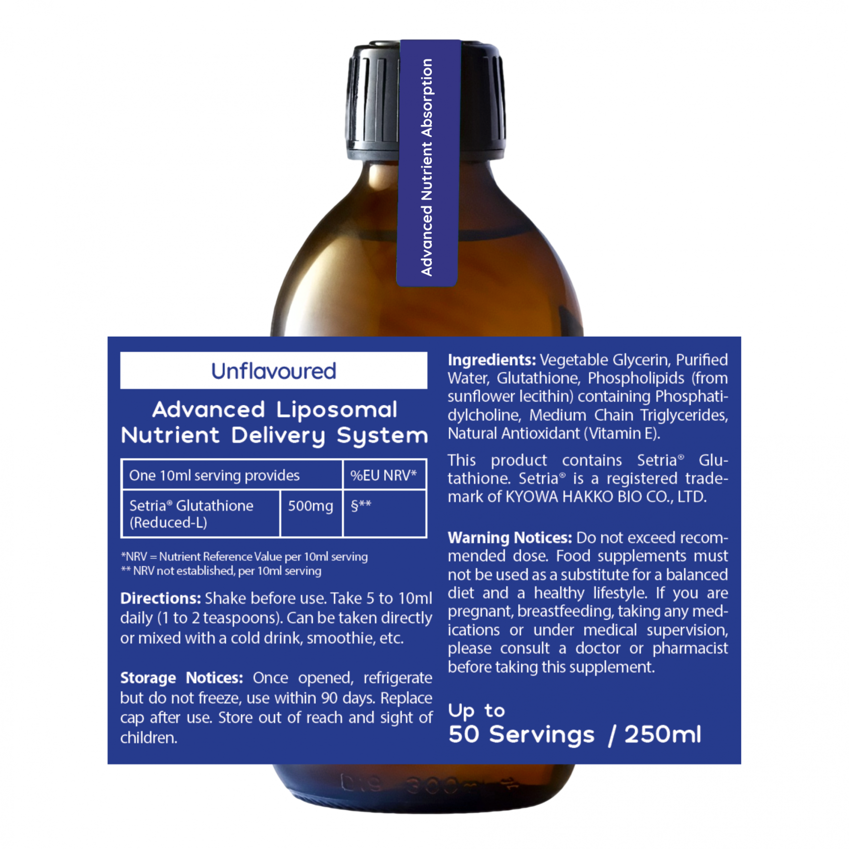 Well.Actually. Liposomal Glutathione PURE liquid with no added flavouring and contains 500mg of 'SetriaĀ®' Reduced L Glutathione in a highly-absorbed form to achieve optimal delivery and effect for supporting immune, detox, and skin health.