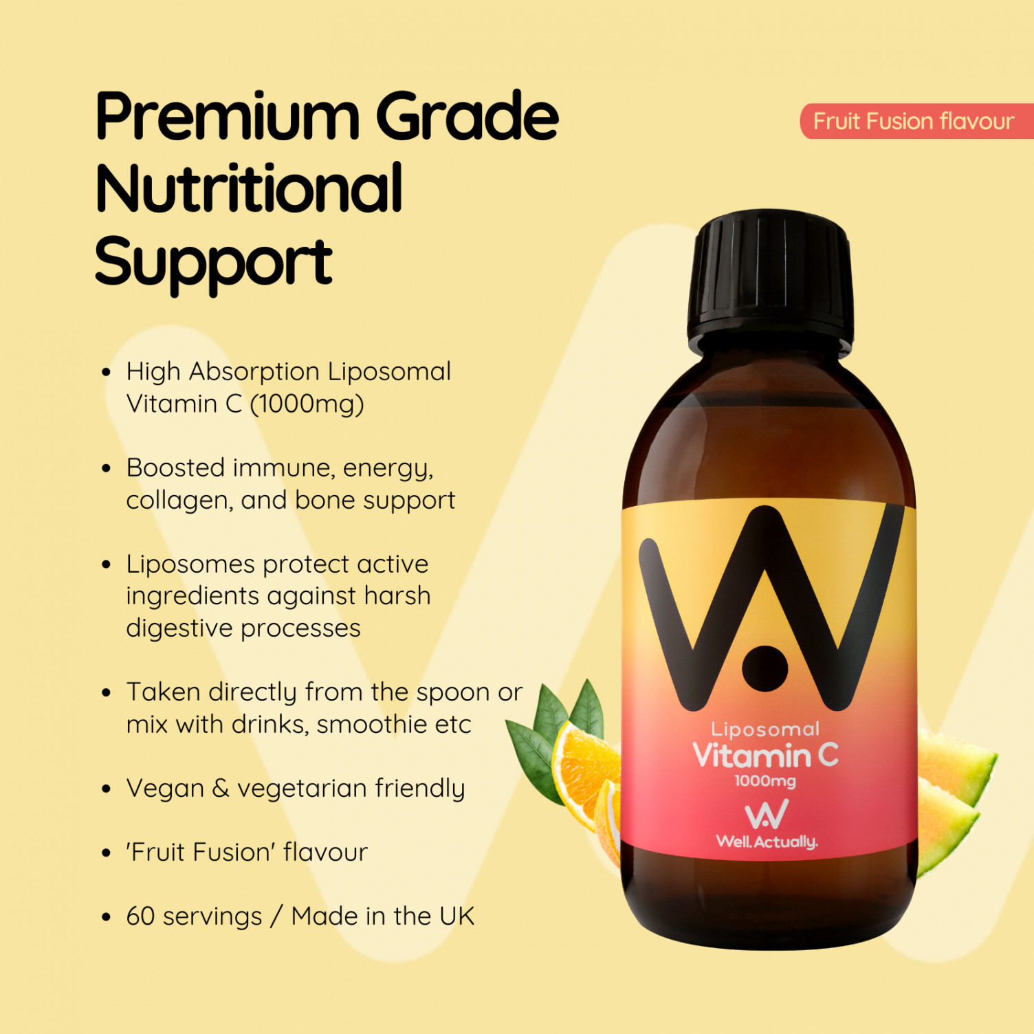 High-Strength Liposomal Vitamin C 1000mg. Encapsulated within Liposomes, this vitamin C is protected against harsh digestive processes and delivered quickly into your cells for optimal absorption. ā€˜Fruit Fusion’ flavour - Made in the UK - Free from preservatives – 30 x 5ml servings (150ml).