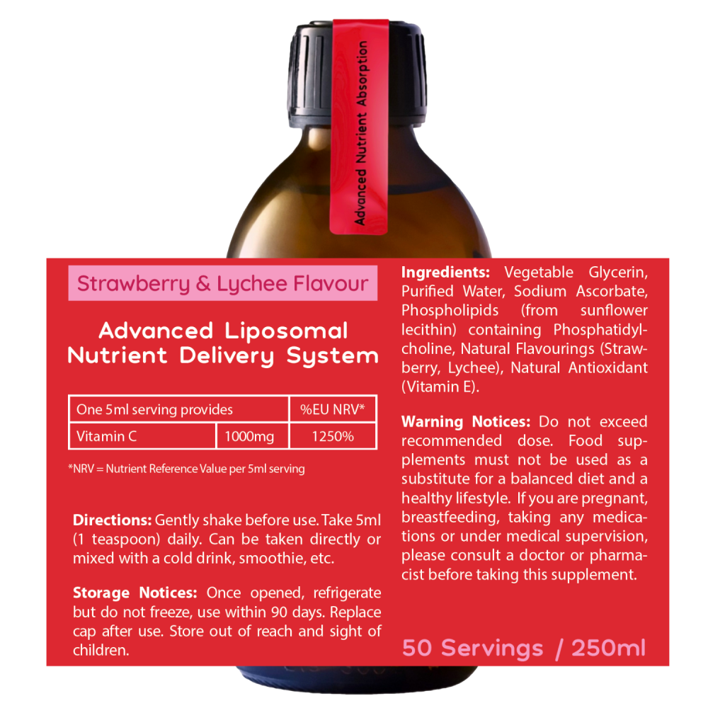 High strength Liposomal Vitamin C 1000mg. Encapsulated within liposomes, this vitamin C is protected against harsh digestive processes and delivered quickly into the cells for optimal absorption. Strawberry & lychee flavour. Made in the UK. Free from preservatives – 50 x 5ml servings (250ml).