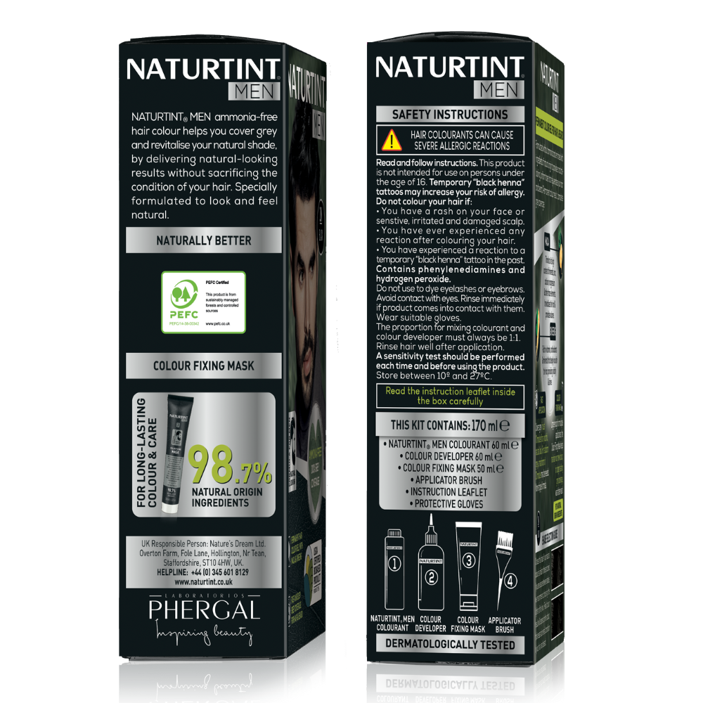 Specifically developed for men and suitable for the hair, beard and moustache. Naturtint Men ammonia-free hair colour helps you to cover 100% of grey and revitalise your natural shade, without sacrificing the condition of your hair. Quick & easy non-drip gel formula, complete with applicator brush.