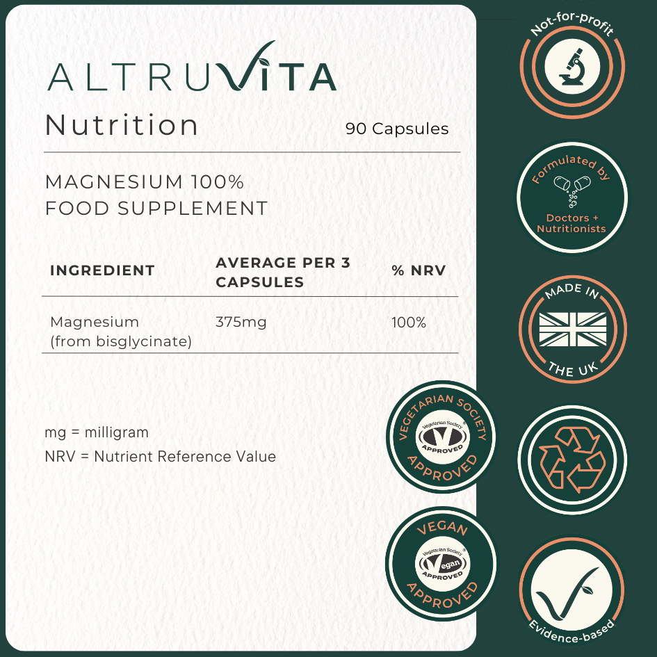 Magnesium is an essential mineral required in small amounts for every bodily system. AltruVita magnesium supplement is from highly absorbable magnesium bisglycinate. This magnesium supplement is bound to two amino acids, which are easily absorbed in the small intestine.