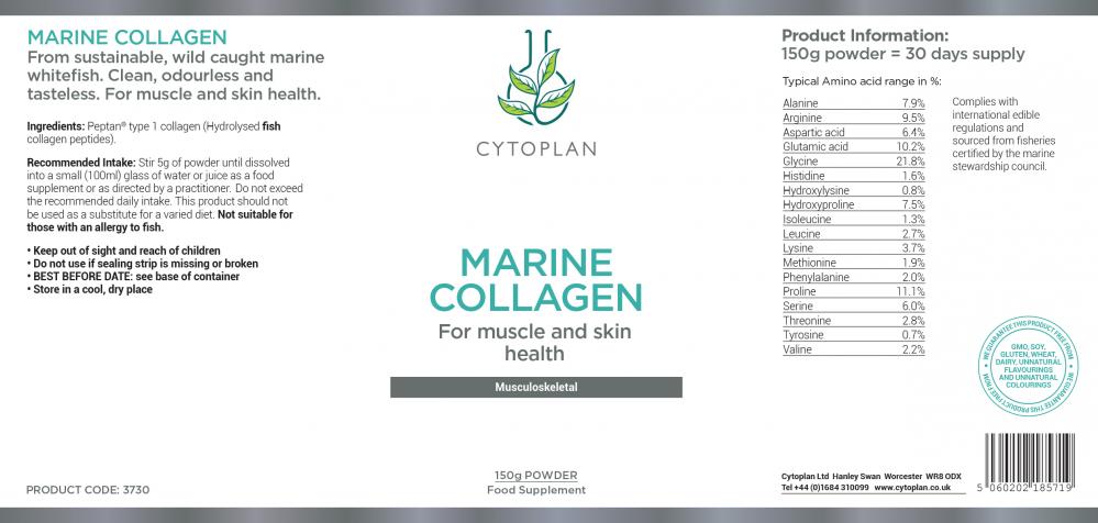 Cytoplan Marine Collagen is a unique, bioactive collagen peptide formulation, certified by the Marine Stewardship Council. Cytoplan use PeptanĀ® type 1 wild caught, sustainable marine collagen peptides from whitefish, which is odourless and tasteless.