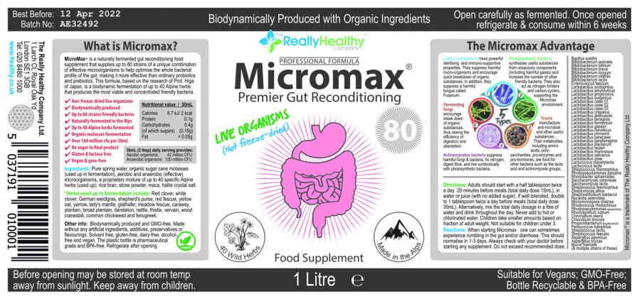 Micromax is a bio-dynamically fermented live gut reconditioning food supplement that contains approximately 80 species of both aerobic and anaerobic microbes that can synergistically help optimise the bacterial population profiles in the gastrointestinal tract.