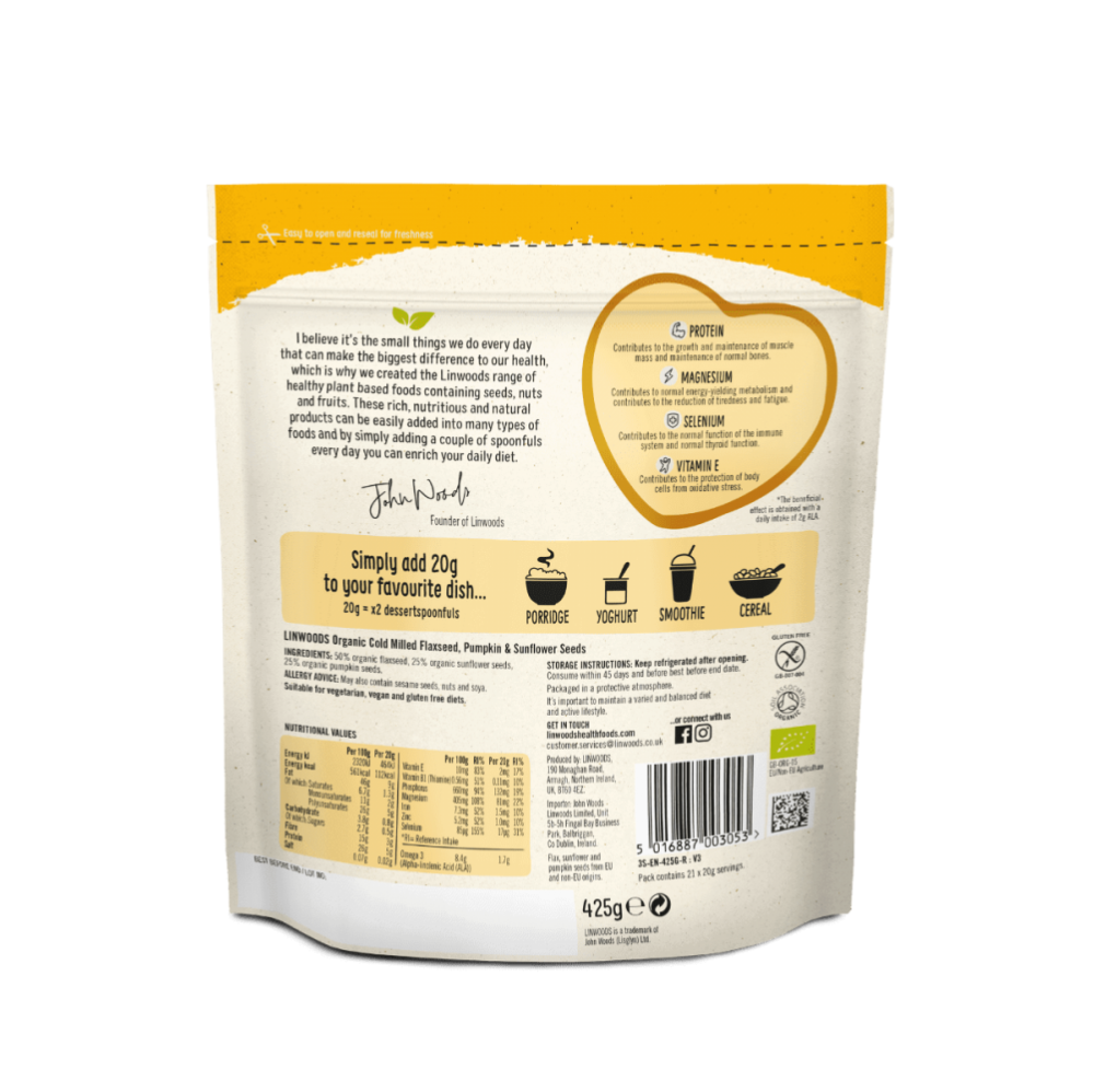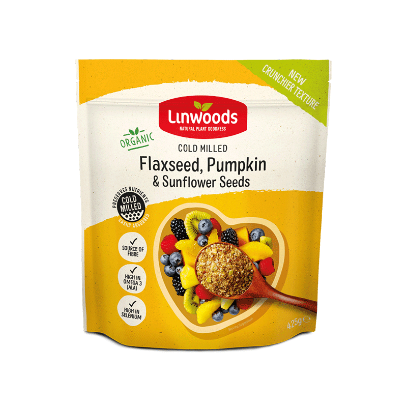 Linwoods Cold Milled Flax, Sunflower & Pumpkin Seeds to preserve nutrients and aid easy absorption after consumption. This seed blend is high in omega 3, selenium and a great source of fibre. Adding seeds to your diet has never been easier.