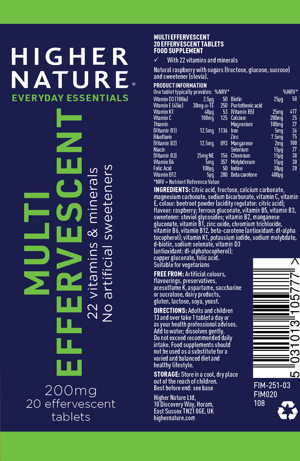 Award-winning Multi Effervescent packed with over 22 essential vitamins and minerals and free from artificial sweeteners, flavours and preservatives. Simply dissolve a tablet in water to create a tasty pick-me-up filled with vitamin E, D3 and C, as well as iron, zinc, magnesium.