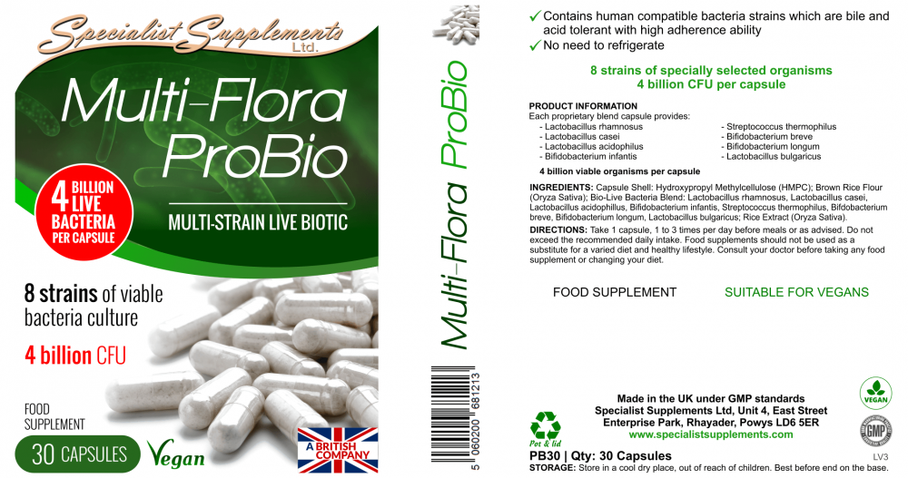 A vegan combination of 8 live culture strains, providing 4 billion viable organisms per capsule: Lactobacillus casei, Lactobacillus rhamnosus, Bifidobacterium breve, Streptococcus thermophilus, Lactobacillus acidophilus, Bifidobacterium longum, Bifidobacterium infantis and Lactobacillus bulgaricus.