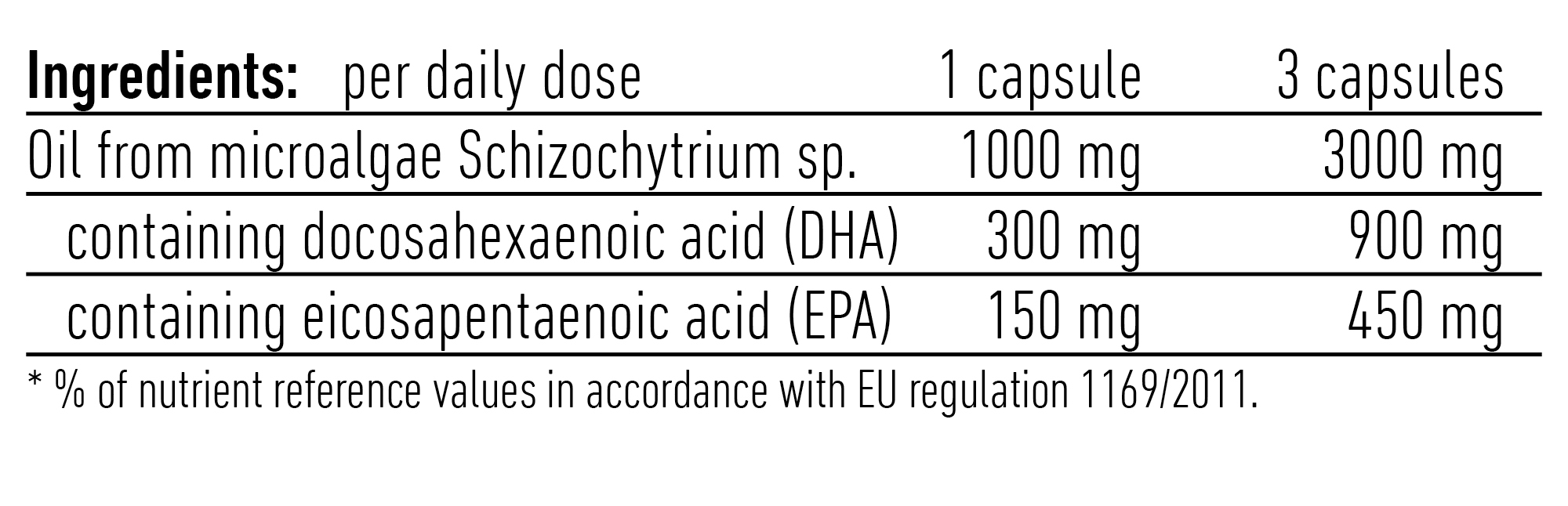 Biogena Omega 3 Vegan DHA & EPA 450 with an exclusive quality-tested algal oil from the microalgae Schizochytrium sp., which has particularly high contents of omega-3 fatty acids DHA and EPA. For the daily supply of these essential polyunsaturated fatty acids from a purely vegetable source.