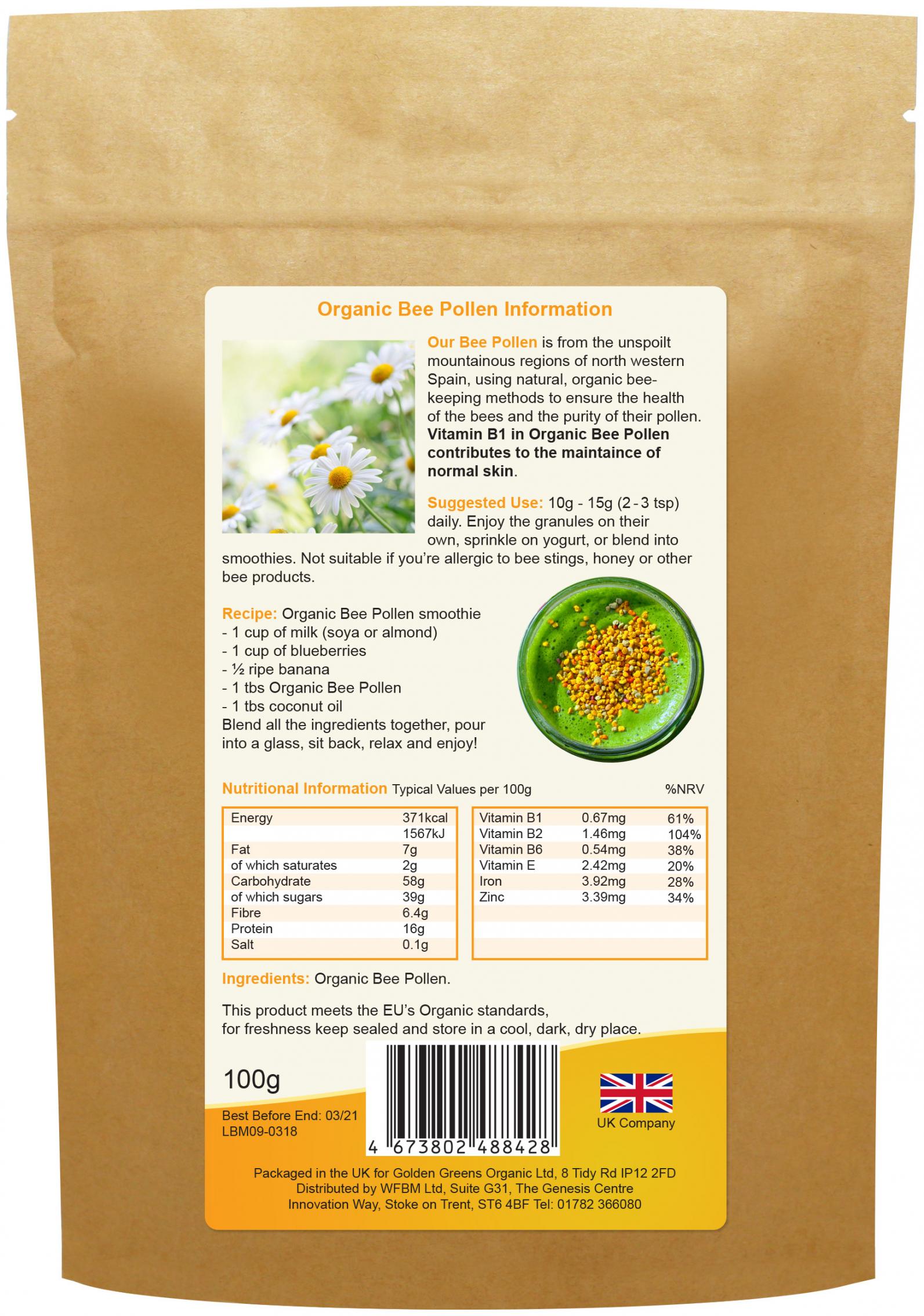 Golden Greens Organic Bee Pollen comes from the mountainous regions of North Western Spain. The process uses natural organic bee keeping methods to ensure the health of the bees and the purity of their pollen. Vitamin B1 and Zinc in Bee Pollen contribute to maintenance of normal skin, hair & nails.