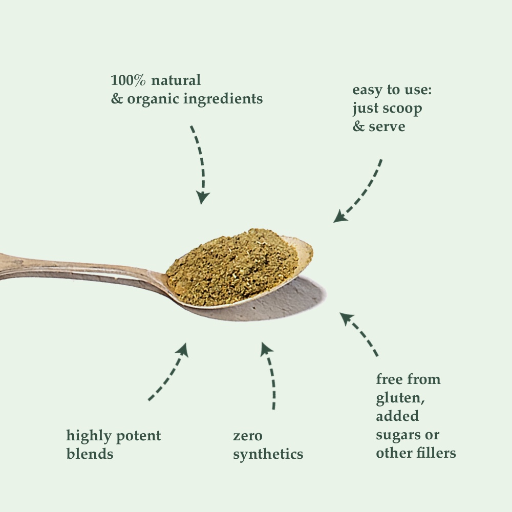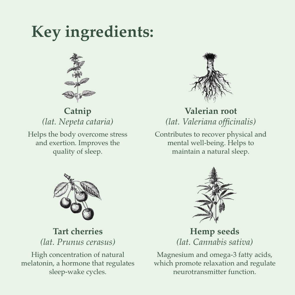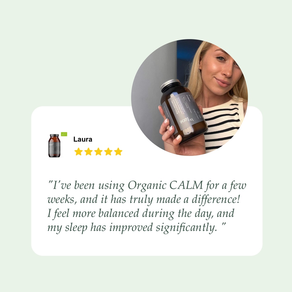A soothing blend for stress support, deep relaxation, and better sleep. Certified organic food supplement based on plant powders. 30-day supply. 100% natural ingredients. Full-spectrum active compounds. Formulated by a pharmacist.