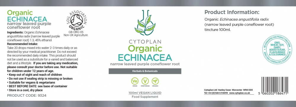 Cytoplan's Organic Echinacea tincture is made from the root of the purple coneflower; Echinacea angustifolia. Echinacea has a long history of traditional use and is especially beneficial during the winter months. Certified organic by the Soil Association.