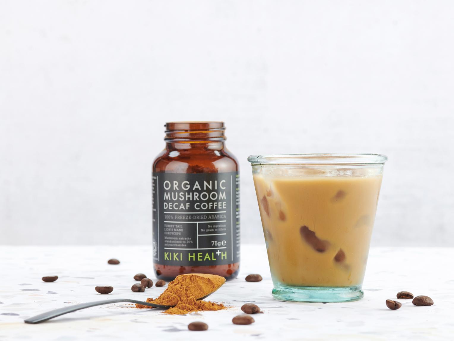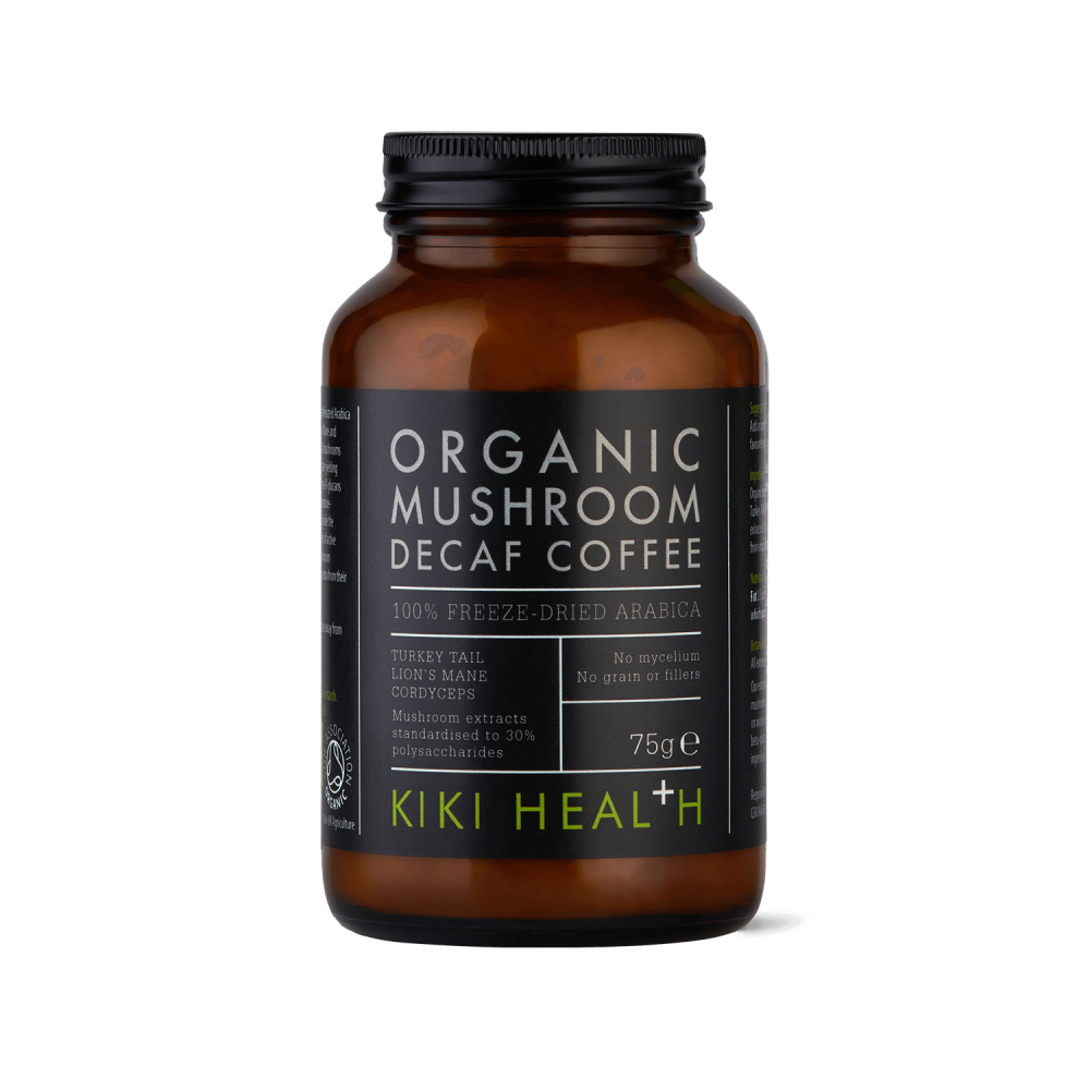Kiki Health's Organic Mushroom Decaffeinated Coffee is a combination of organic 100% decaffeinated Arabica coffee and functional, certified organic mushroom extracts from the fruiting bodies of Lion’s Mane, Reishi and Cordyceps mushrooms.