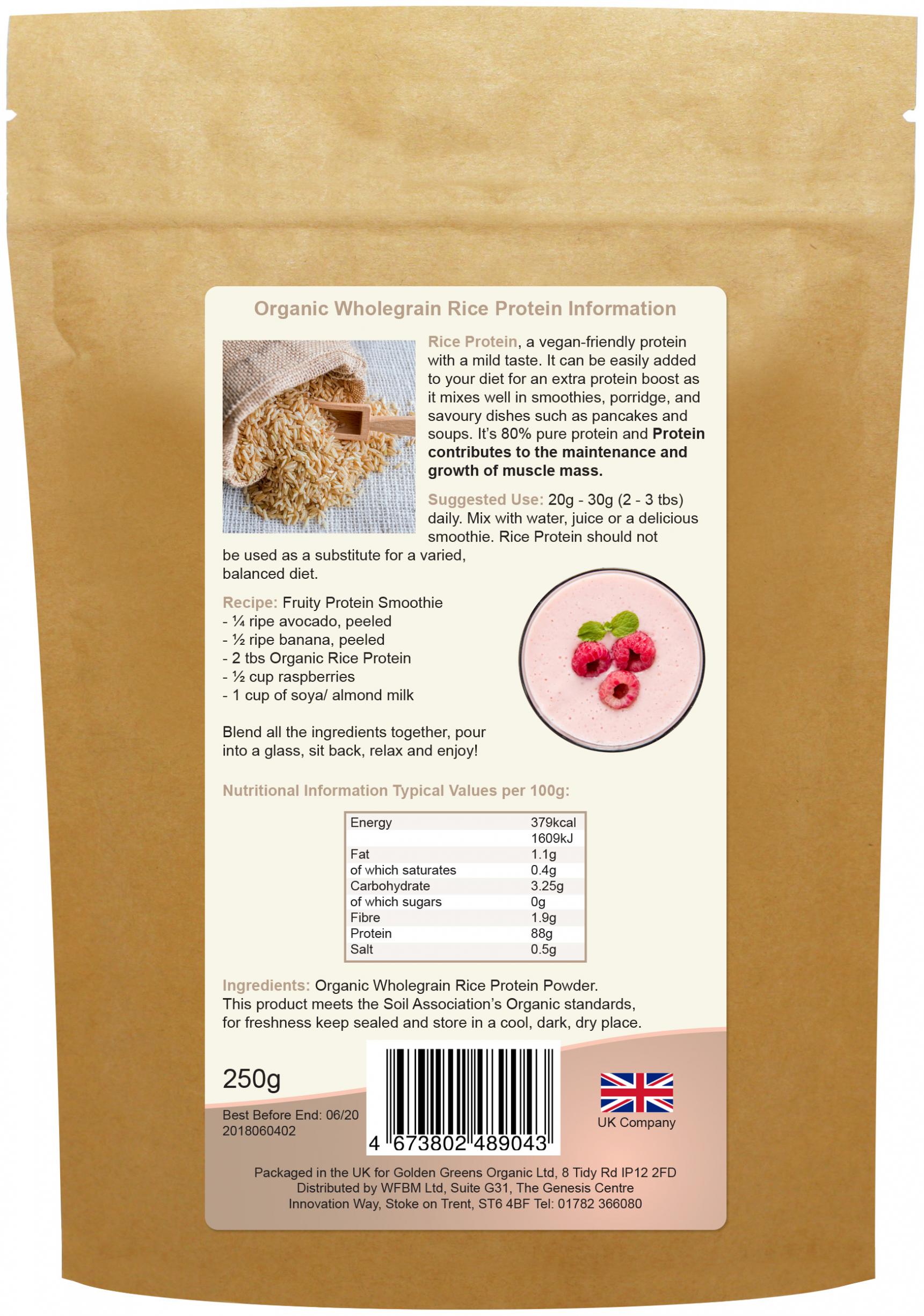 Golden Greens Organic Wholegrain Rice Protein Powder is a vegan friendly protein with a mild taste. It can easily be added to your diet for an extra protein boost as it mixes well in smoothies, porridge and even savoury dishes such as pancakes and soups.