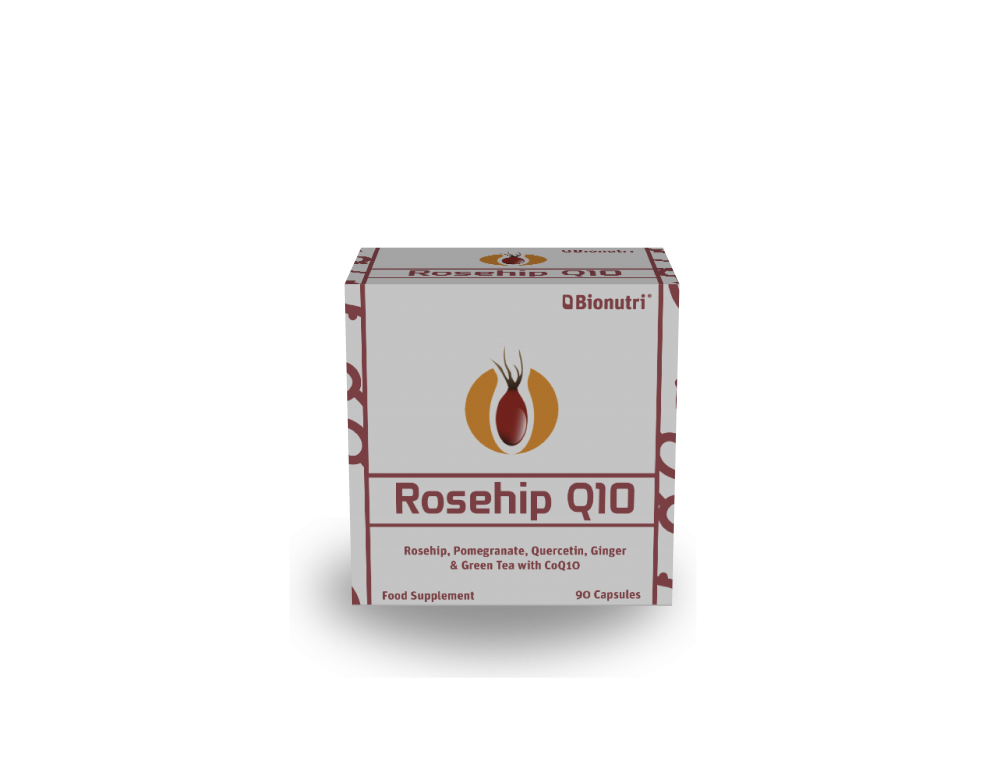 Rosehip Q10 is a combination of food botanicals. Apart from rosehip it incorporates ginger root, pomegranate hulls, and green tea extract along with co-enzyme Q10 and quercetin.