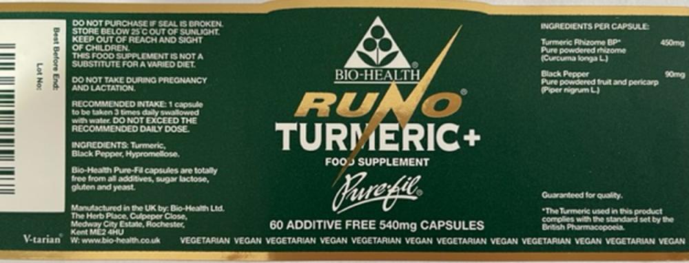 Bio-Health Runo Turmeric Plus provides powdered turmeric rhizome (Curcuma longa L.) with black pepper (piperine) added for enhanced absorption.