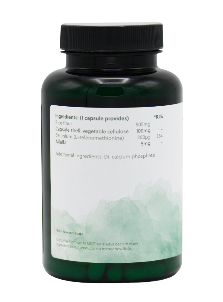 G&G high-strength selenium supplement uses L-selenomethionine as it is an organic form of selenium. The bioavailability of selenium from L-selenomethionine has been shown to be up to three times higher than that of inorganic forms of selenium. Suitable for vegetarians and vegans, approved kosher.