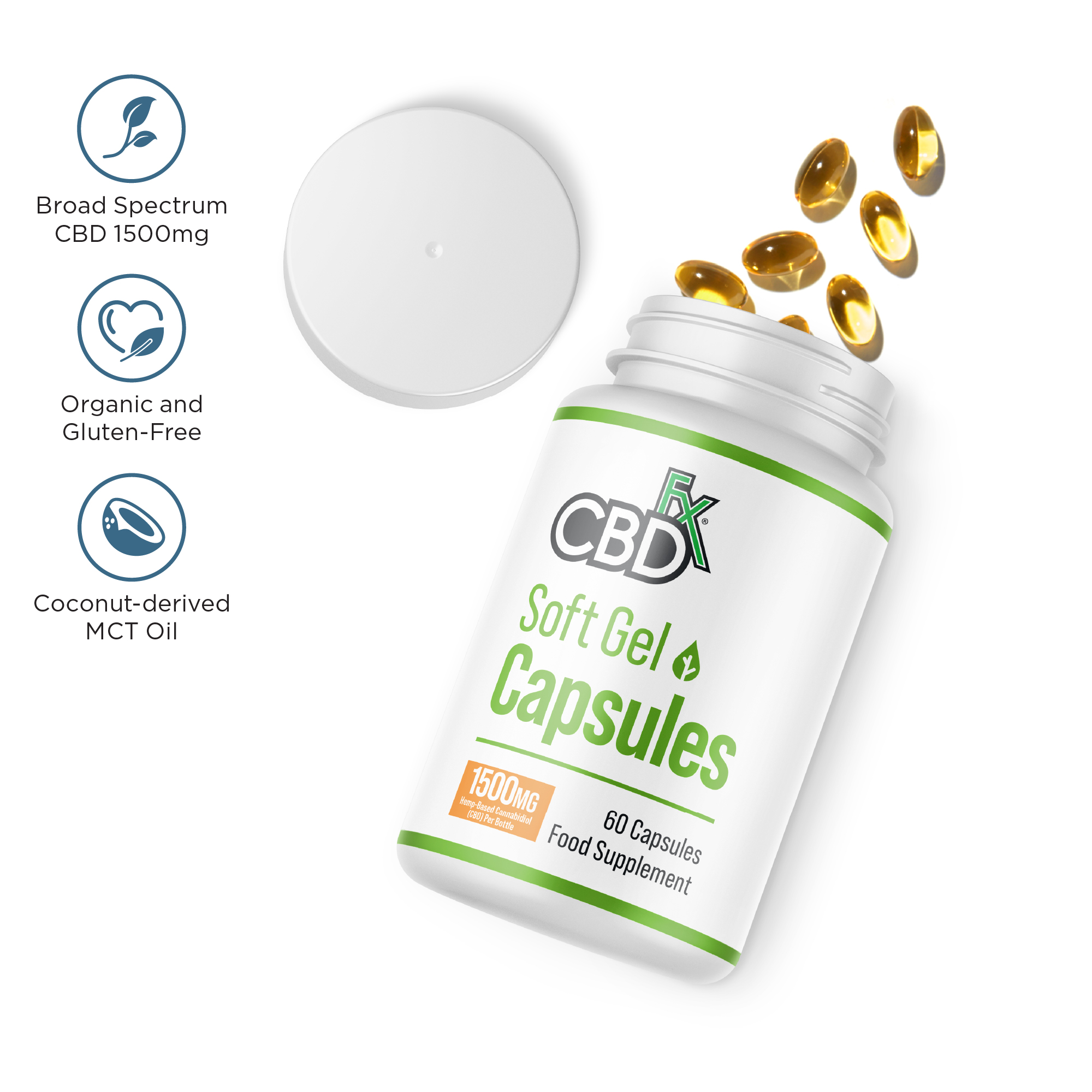 This bottle of CBDfx CBD gel caps contains premium quality broad spectrum hemp extract from organically grown industrial hemp providing a total of 1500mg (25mg per softgel) of cannabidiol (CBD). Just a blend of medium chain triglyceride oil and amazing hemp extract - nothing else.