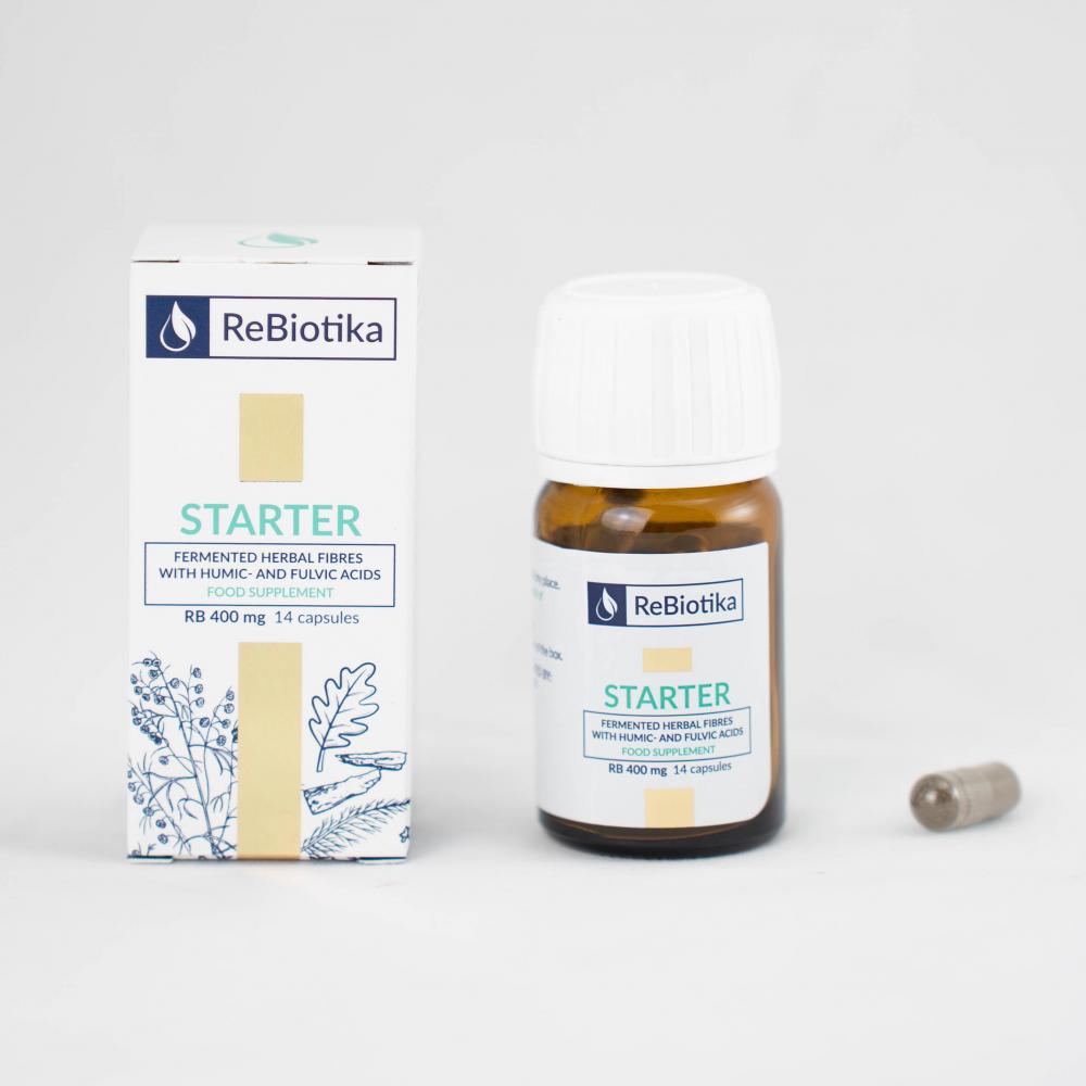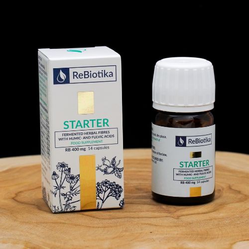 Rebiotika Starter capsules contain pre-fermented plant fibres, humic acid and fulvic acid, which support gut barrier integrity, and aid detoxification to kickstart microbiome re-establishment. It acts as a "seedbed" for beneficial gut microbes, complementing the ReBiotika Drops.