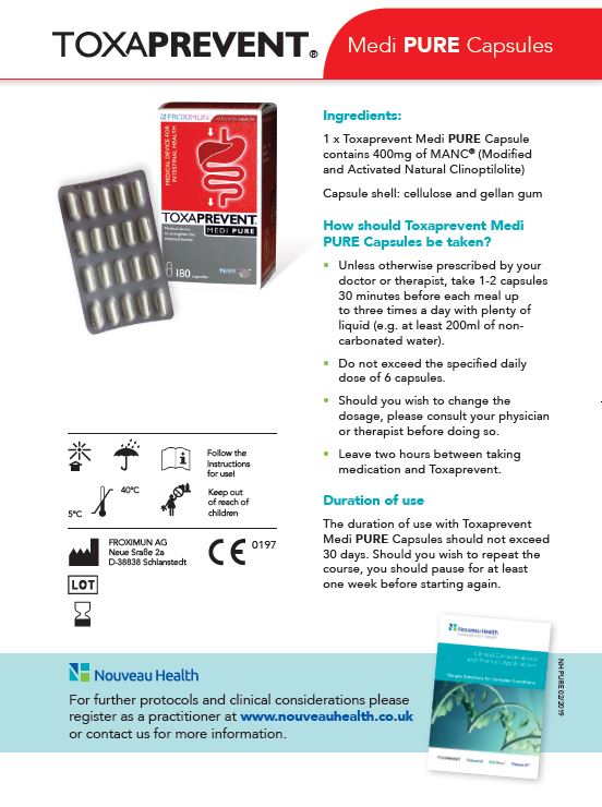 Toxaprevent Medi PURE Capsules bypass the stomach to absorb and remove toxic substances from the lower intestinal tract (intestines and colon). The active ingredient MANCĀ® (Modified and Activated Natural Clinoptilolite) is a clean form of zeolite which is patented for its ability to absorb toxins.