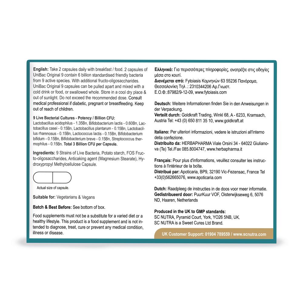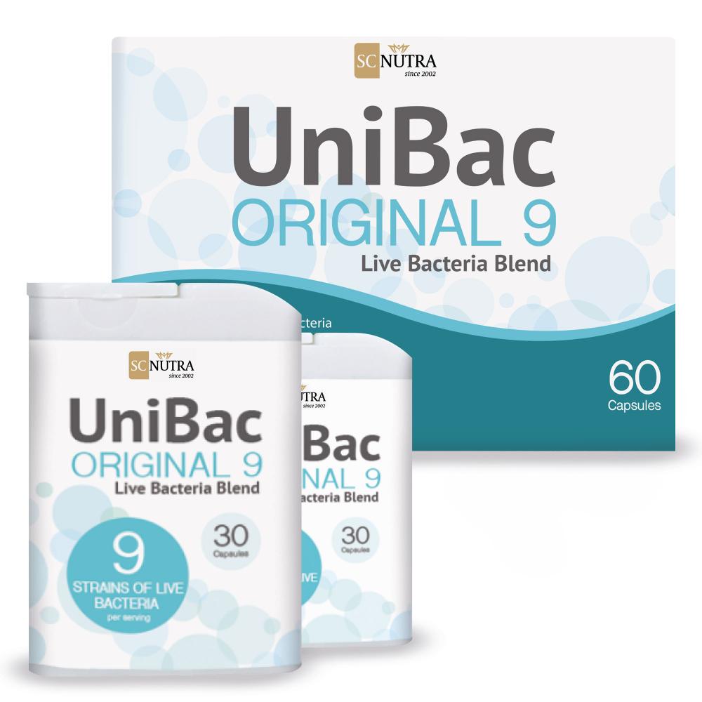 UniBac Original 9 is an everyday friendly bacteria blend providing over 6 billion live bacteria per two capsules. With nine unique strains for daily health. UniBac Original 9 does not need to be refrigerated, packaged in two handy dispensers.