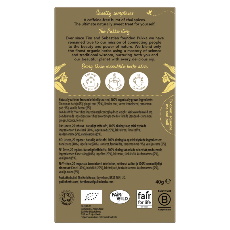 Caffeine-free vanilla chai with sweet, warming herbs for you to enjoy. It contains a mix of six organic and Fairtrade herbs sourced from small, independent farmers around the world.