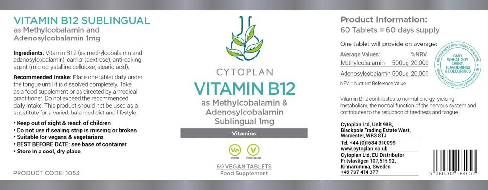 A high potency active B12 supplement containing 1mg of methylcobalamin and adenosylcobalamin, both of which provide great benefit to the body.