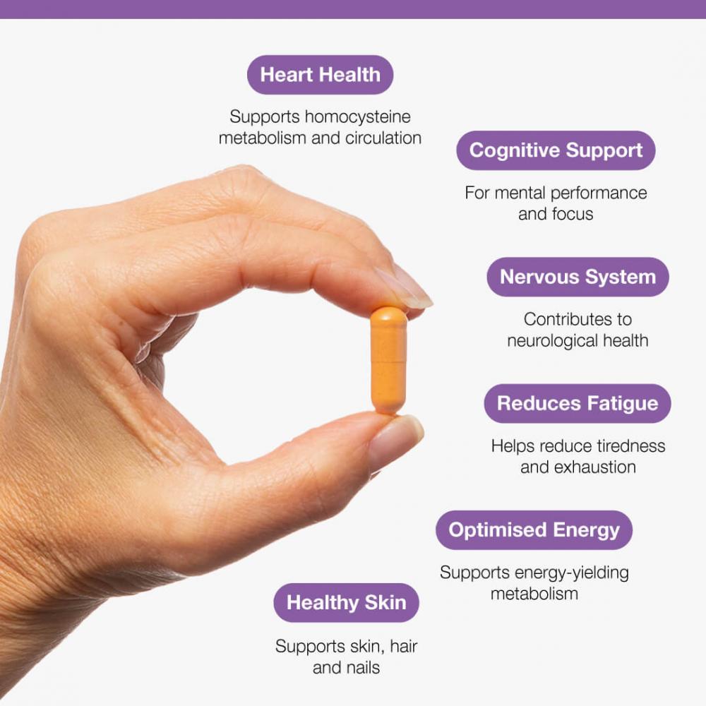 High-potency Vitamin B Complex with active methylated folate, B12, B6 & B2 for optimal methylation support. Includes choline & inositol for nervous system and liver function, plus PABA to aid folate metabolism. Ideal for vegetarians, vegans, and those needing targeted support for energy and heart.