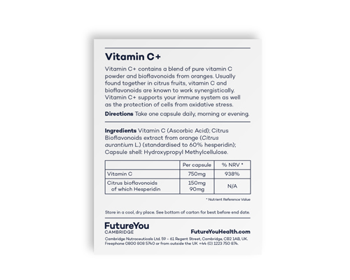 Vitamin C+ contains a blend of pure vitamin C powder and bioflavonoids from oranges. Usually found together in citrus fruits, vitamin C and bioflavonoids are known to work synergistically. Vitamin C+ supports your immune system as well as the protection of cells from oxidative stress.