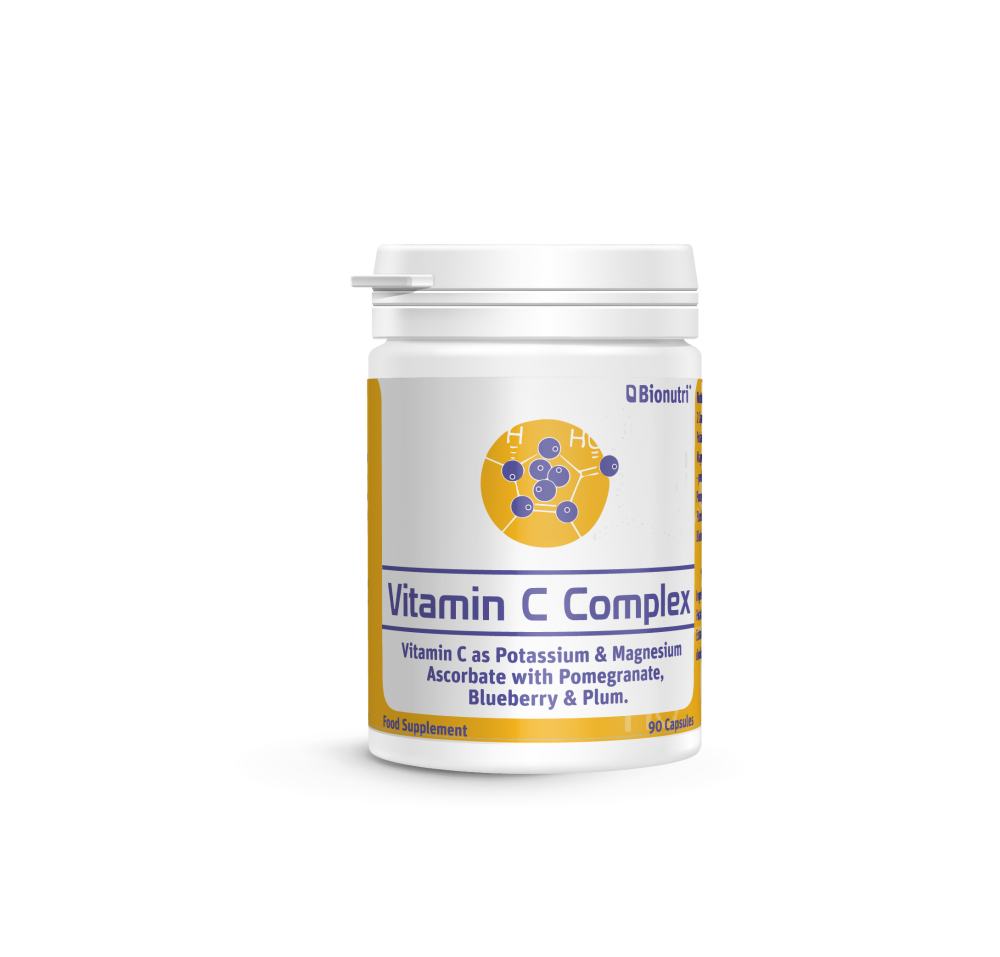 A combination of two highly bioavailable, non-acidic, separate mineral sources of vitamin C (potassium ascorbate and magnesium ascorbate) along with broad spectrum flavonoids from powdered extracts of three different fruits - pomegranate, plum and blueberry.