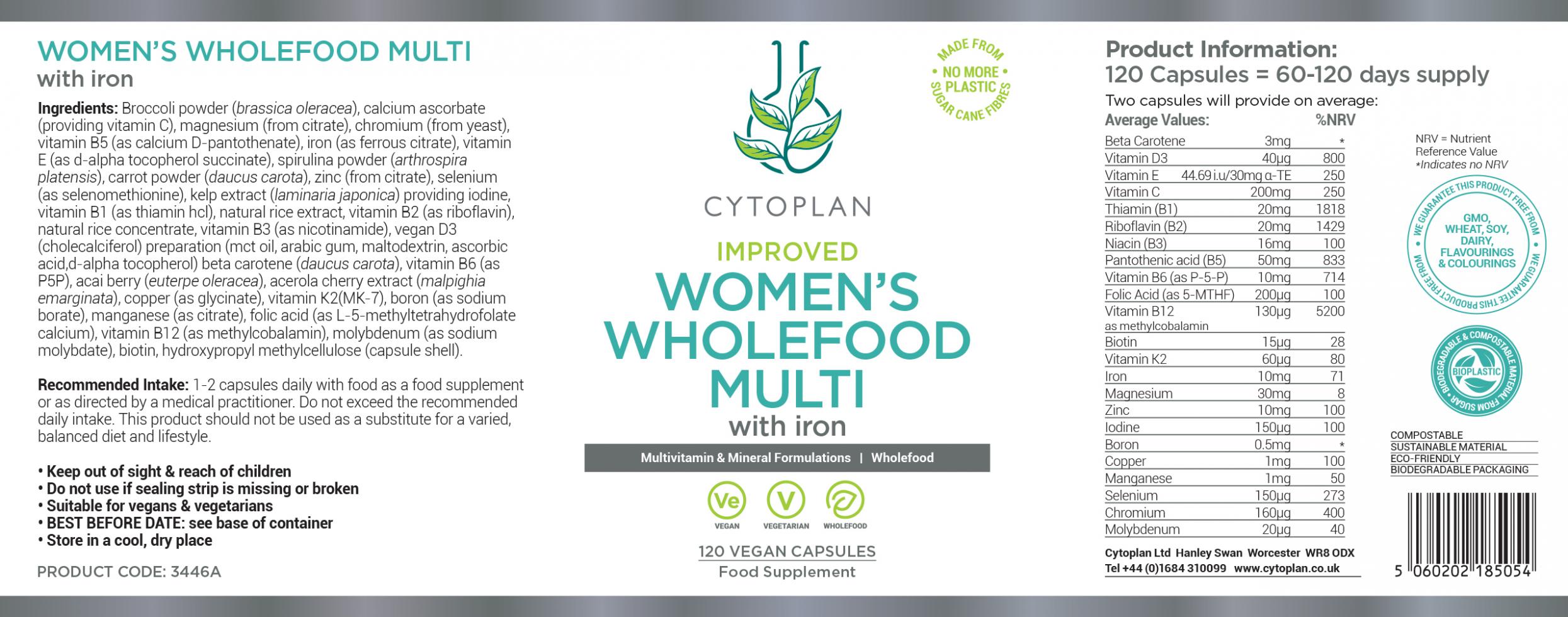 Women's Wholefood Multi with Iron is a comprehensive wholefood multivitamin and mineral supplement providing 5mg of iron per capsule (in the form of ferrous fumarate), alongside antioxidants, vitamin D and chromium. Ideal for teenagers, menstruating women or those with low iron levels.