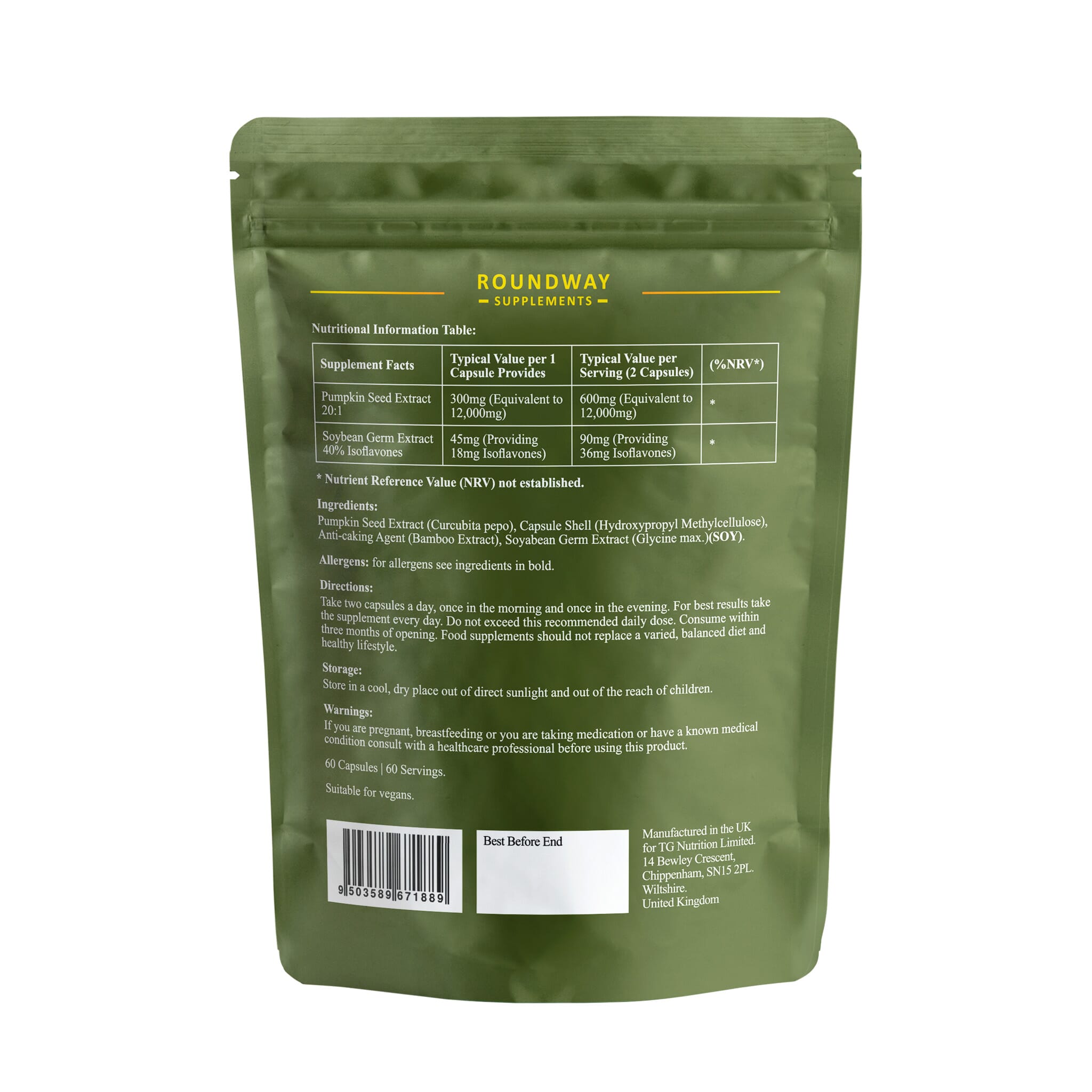 Roundway’s Pumpkin Seed and Soy Germ Capsules bring together a concentrated blend of 600 mg pumpkin seed extract (20:1) and 90 mg soy germ extract per 2-capsule serving—delivering the equivalent of 12,000 mg of raw pumpkin seed.