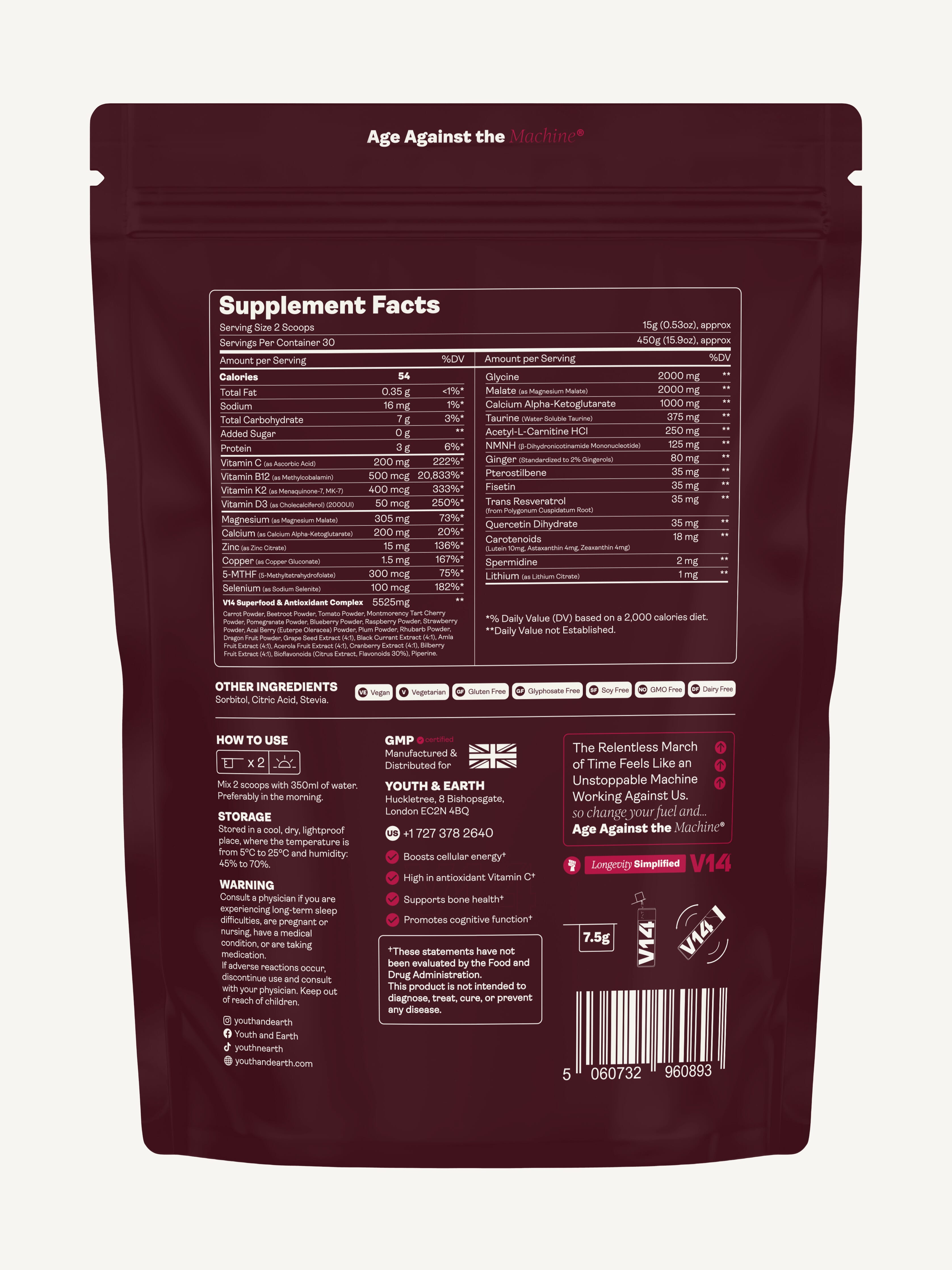V14 Longevity Reds delivers 14 science-backed longevity ingredients in one daily sachet to support cellular energy, healthy ageing, cognition, heart health and inflammation. Packed with antioxidants, polyphenols and superfruits for all-in-one daily longevity support.